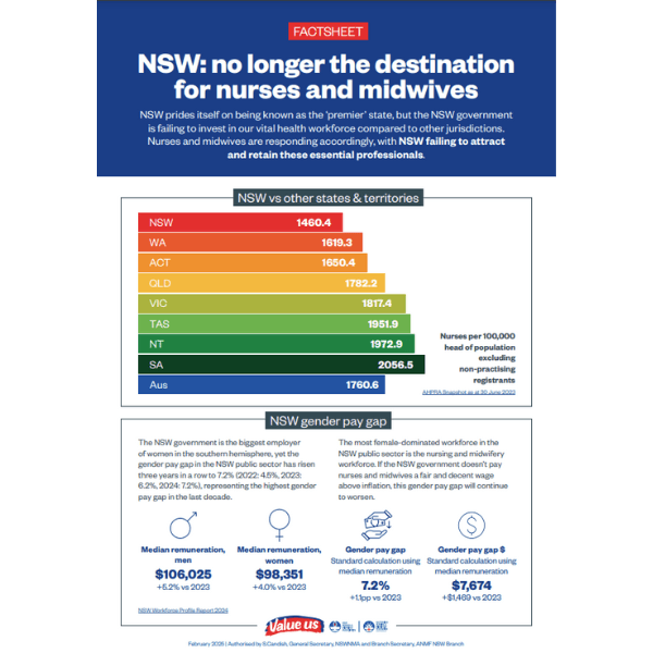 - NSW is losing the next generation of nurses and midwives: Recent nursing and midwifery graduates are taking their skills interstate, because entry level nurses and midwives in NSW are the lowest paid in the country. If we can’t attract and retain talent, our healthcare system will only deteriorate further.
